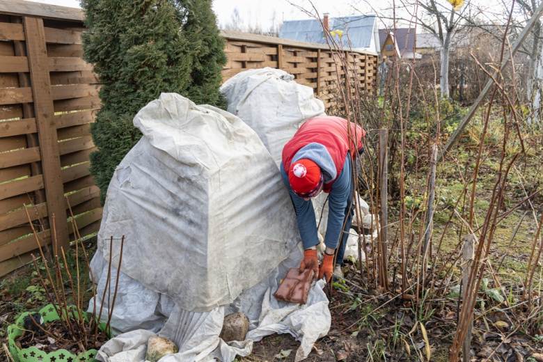 Розы: кусты окучивают, удаляют соцветия, укладывают лапник или мешковину вокруг, при желании — каркас. Сверху укрывают спанбондом или агроволокном плотностью 50–60 г/м². Важно, чтобы материал не касался напрямую листьев.